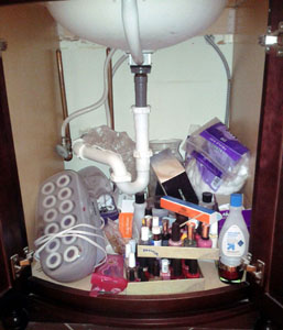 You see, I’ve been putting off organizing the cabinet under my bathroom sink for months. It’s easy to pretend the mess isn’t there when it’s hidden. And, it’s so easy to hide: just close the door and it’s gone! Outa sight. Outa mind. Life is good.