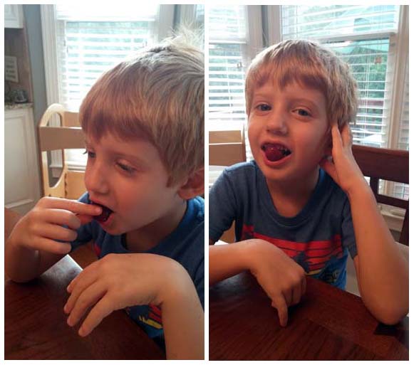 Last week our grandson, Matthew, was having fun eating cherries and when I told him that Cherry Pit Spitting is a very real competition, he got rightto work on his technique.