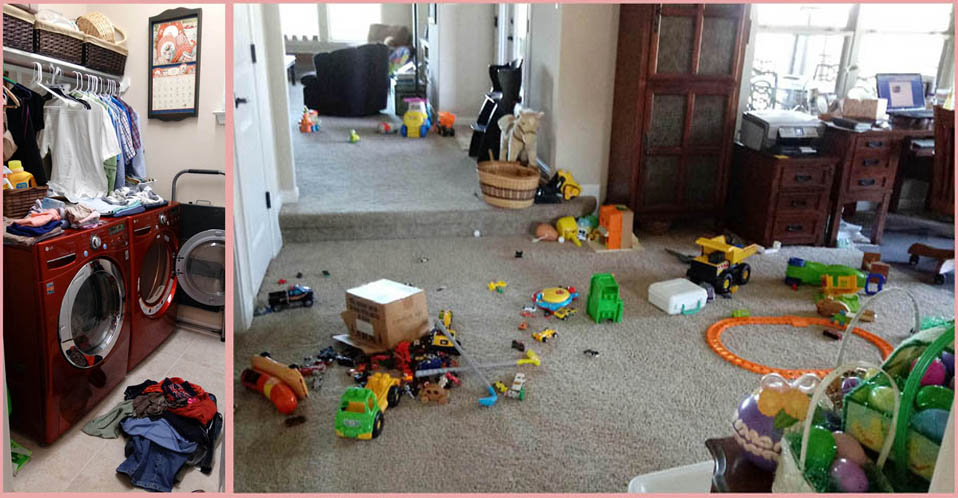 Oh, and let’s not forget the “I’m-Too-Pooped-To-Care-Day” when toys are strewn everywhere and laundry is lucky to make it to the top of the washer and dryer let alone actually into the dresser drawers and closets and a neighbor happens to stop by for a visit.